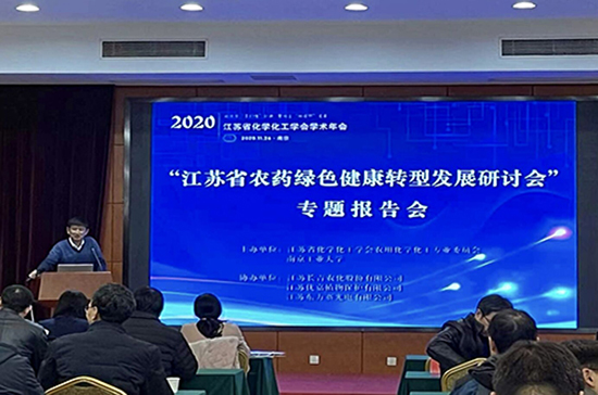 2020年11月26日,由江苏省化学化工学会农用化学化工专业委员会和南京工业大学主办的“2020年江苏省农药绿色健康转型发展研讨会”在江苏南京隆重召开。全省农药行业企业代表,专业委员会委员和高校师生等70余位代表参加会议,中国化工学会精细化工专业委员会主任、工业防霉防菌产业技术创新战略联盟理事长伍振毅和省化学化工学会秘书长等莅临并致辞。