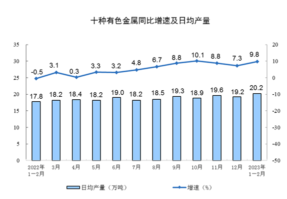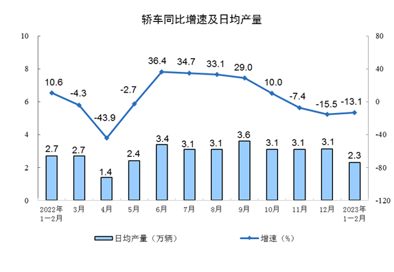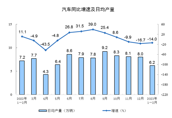 分产品看,1—2月份,620种产品中有269种产品产量同比增长。钢材20623万吨,同比增长3.6%;水泥19855万吨,下降0.6%;十种有色金属1192万吨,增长9.8%;乙烯508万吨,下降1.7%;汽车365.3万辆,下降14.0%,其中新能源汽车97.0万辆,增长16.3%;发电量13497亿千瓦时,增长0.7%;原油加工量11607万吨,增长3.3%。