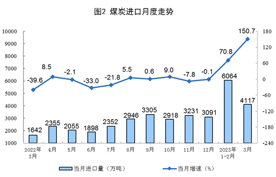 原煤生产稳定增长,进口大幅增加。3月份,生产原煤4.2亿吨,同比增长4.3%,增速比1—2月份放缓1.5个百分点,日均产量1346万吨。进口煤炭4117万吨,同比增长150.7%,增速比1—2月份加快79.9个百分点。