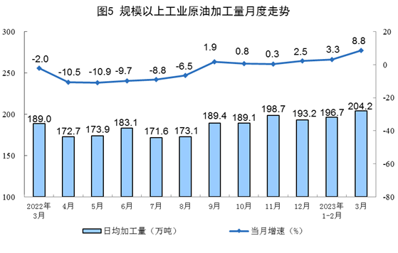 原油生产略有加快,进口由降转增。3月份,生产原油1818万吨,同比增长2.4%,增速比1—2月份加快0.6个百分点,日均产量58.7万吨。进口原油5231万吨,同比增长22.5%,1—2月份为下降1.3%。