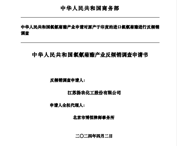 调查公告显示,今年4月2日,商务部收到扬农化工(或称“申请人”)代表中国氯氰菊酯产业正式提交的反倾销调查申请,申请人请求对原产于印度的进口氯氰菊酯进行反倾销调查。