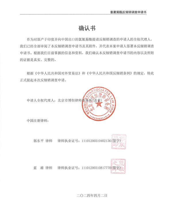 因此,商务部决定自2024年5月7日起,对原产于印度的进口氯氰菊酯进行反倾销立案调查。本次调查确定的倾销调查期为2023年1月1日至2023年12月31日,产业损害调查期为2019年1月1日至2023年12月31日。