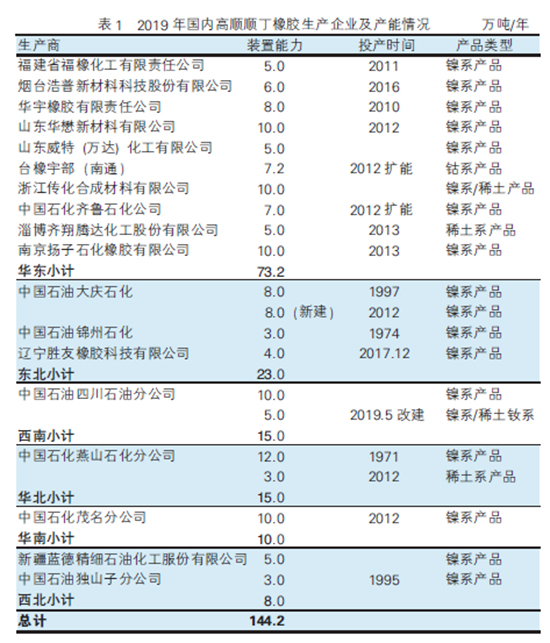 截至2019年底,国内高顺顺丁橡胶总产能为144.2万吨/年,同比2018年产能减少,主要是巴陵石化6万吨/年顺丁橡胶(1974年投产)去产能整合。国内生产企业由19家减为18家,其中华东10家、华北1家、华南1家、华中1家、东北3家、西北2家。从产能分布来看,华东地区是高顺顺丁橡胶的主要生产地,已占国内总产能的51%。从装置采用的催化剂来看,2019年新增一套稀土柔性装置,即四川石化引进俄罗斯稀土钕系顺丁橡胶技术,将其15万吨/年镍系顺丁橡胶装置通过局部改造,于2019年5月实现5万吨/年钕系顺丁橡胶的设计产能,并可与原有镍系顺丁生产正常切换。截至2019年底,我国共有镍系装置16套,稀土及稀土柔性装置4套,钴系装置1套。2019年国内主要高顺顺丁橡胶生产企业及产能统计如表1所示。