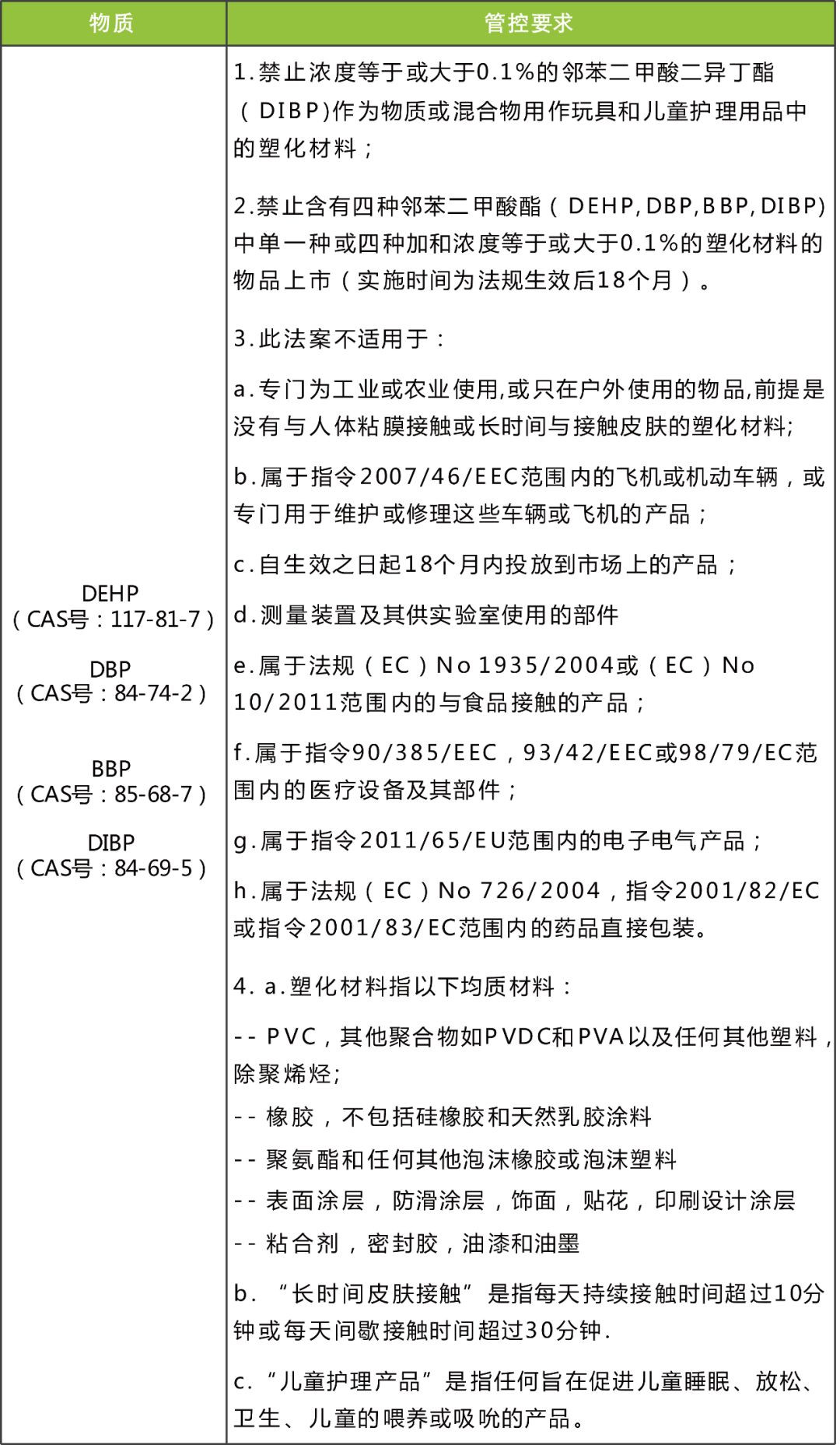 2018年3月28日,欧盟委员会向WTO提交了通报草案G/TBT/N/EU/564,拟修订REACH法规限制篇(附录XVII)第51条邻苯二甲酸酯的管控要求。该草案提议欧盟REACH附录XVII将限用塑化材料中的四种邻苯二甲酸酯,包括DIBP,DEHP,DBP和BBP,较之前条款主要新增了DIBP的管控要求。